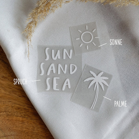 Bügelbild 3er Set - Palme Sonne & Schriftzug "sun sand sea"
