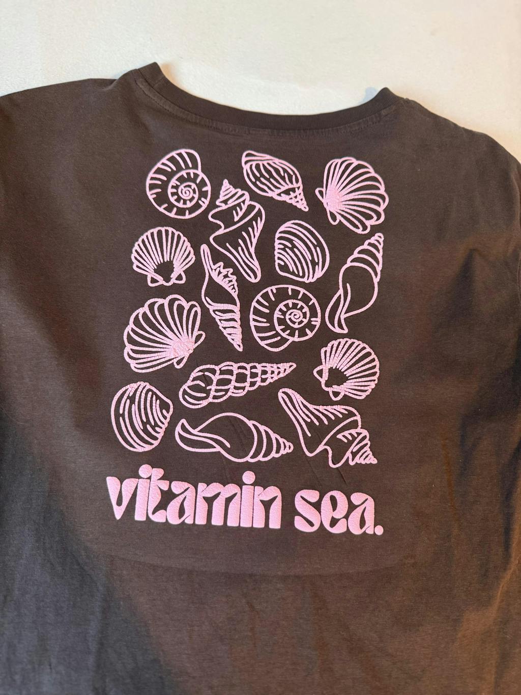 Und auf dem Rücken - Muscheln, im Line Art Stil, das nach Urlaub aussieht – darunter der Schriftzug „Vitamin Sea“.